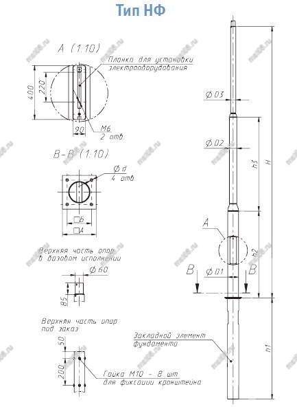 Подвод кабеля осуществляется подземным способом, ведь опора является несиловой и не может принимать на себя большие горизонтальные нагрузки. Для обслуживания электрооборудования в нижней части расположен ревизионный люк.